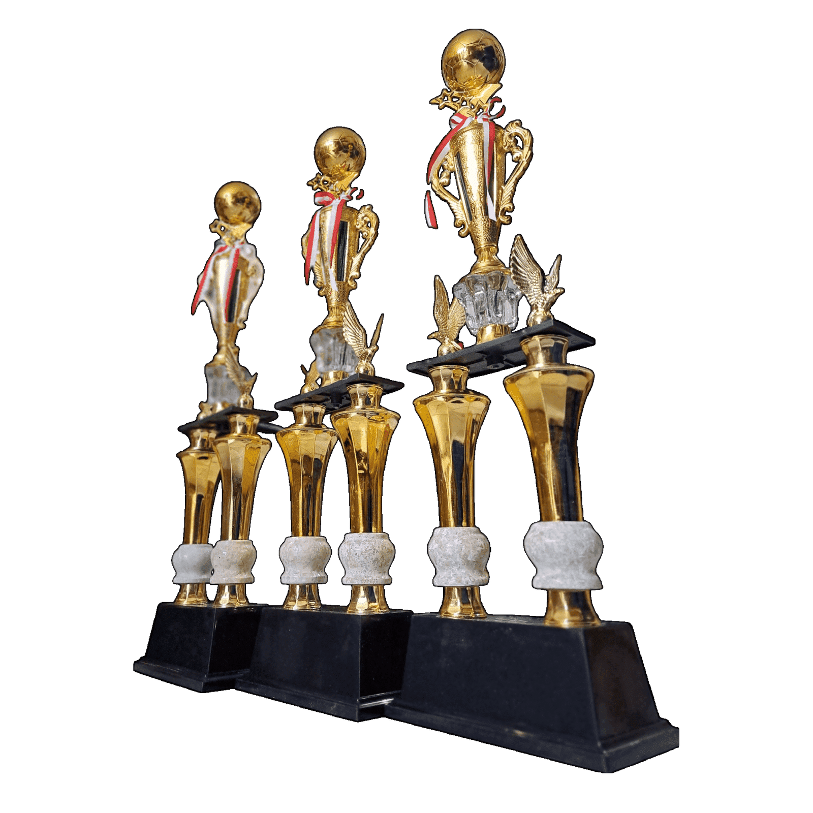 Sempurnakan momen juara Anda dengan GoTrophy SET-23, set piala elegan yang terdiri dari tiga tingkatan untuk Juara 1, 2, dan 3. Desainnya yang menawan menampilkan figur plastik berkode FG-35 (tinggi 13,5 cm) sebagai ornamen puncak. Bagian atasnya memadukan aksen emas plastik bertingkat (“Tangga” dengan tinggi 6,5 cm, 4 cm, dan 2,5 cm), penutup kaca bening elegan dengan sentuhan emas (RRB tinggi 7 cm), dan bodi plastik emas-hijau yang dinamis (Body 01 tinggi 17 cm).