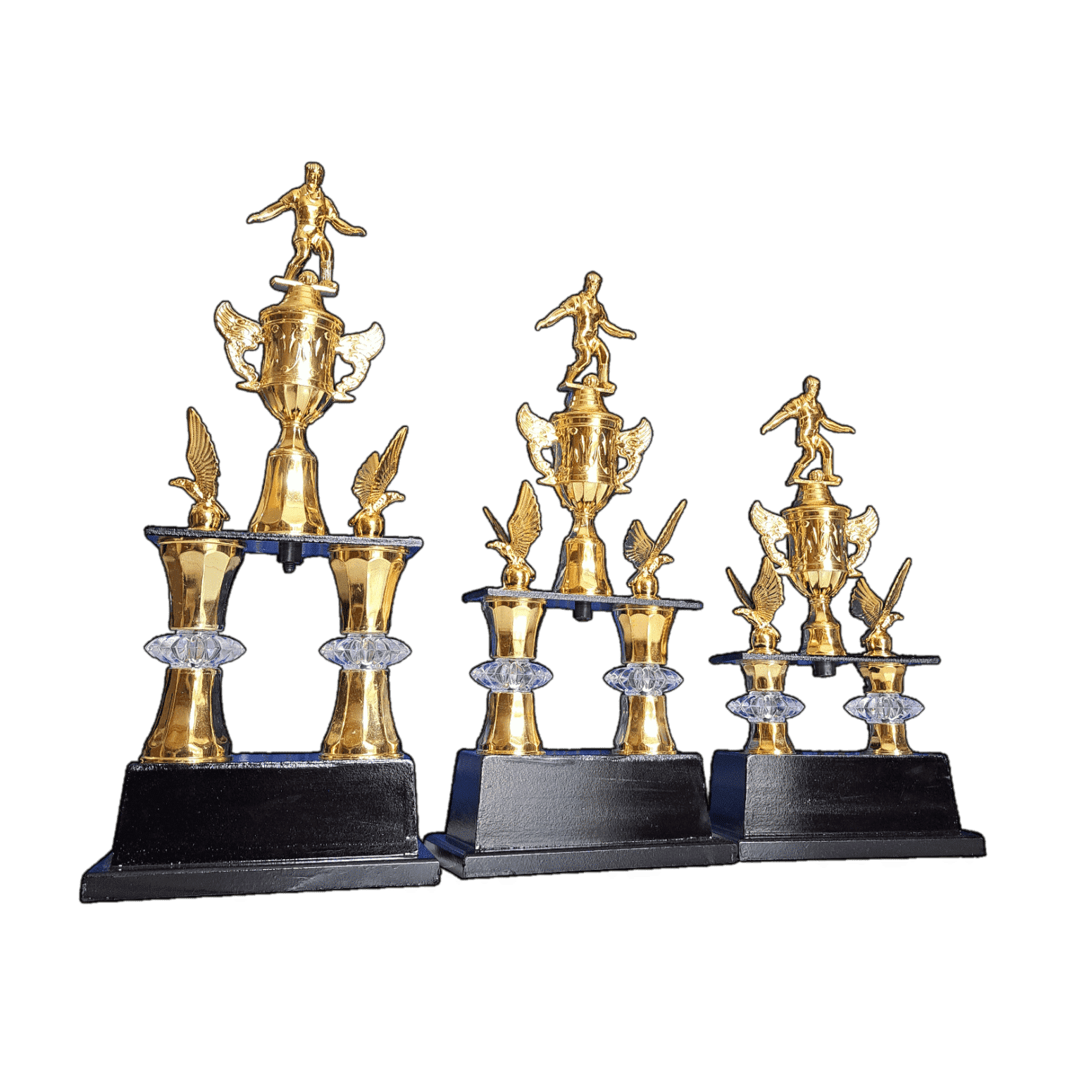 Abadikan momen juara dengan Set Piala “Set-24” yang elegan dan berjenjang. Terdiri dari 3 piala untuk Juara 1 (tinggi 55 cm), Juara 2 (tinggi 47,5 cm), dan Juara 3 (tinggi 43 cm). Setiap piala menampilkan figur plastik kode FG-36 (tinggi 12 cm) sebagai ornamen puncak. Detail emas berkilauan menghiasi bagian atas (kode Tangga dan Body 06) serta pilar bertingkat yang dikombinasikan dengan aksen bening (kode 212) dan base hitam kokoh (kode K2M (PA) tinggi 9 cm). Set piala ini adalah pilihan sempurna untuk menghargai setiap pencapaian