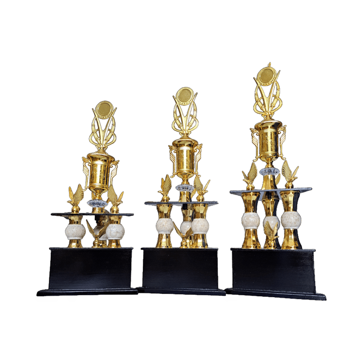 Desain Bertingkat: Disusun dengan struktur Raset/Tangga berlapis, membuat piala terlihat jenjang dan kompleks (tidak polos).