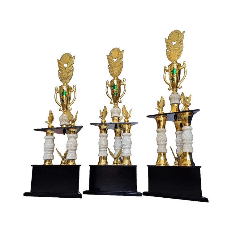 Hadirkan kemewahan mutlak pada event Anda dengan Piala Set SET-27. Ini adalah definisi piala “Sultan”. Dengan tinggi mencapai 86cm dan konstruksi yang sangat kompleks, piala ini dirancang untuk memberikan kesan agung dan prestisius. Beratnya yang mantap (karena kombinasi kayu dan dua susun marmer) membuatnya terasa sangat berharga saat diangkat oleh sang juara.