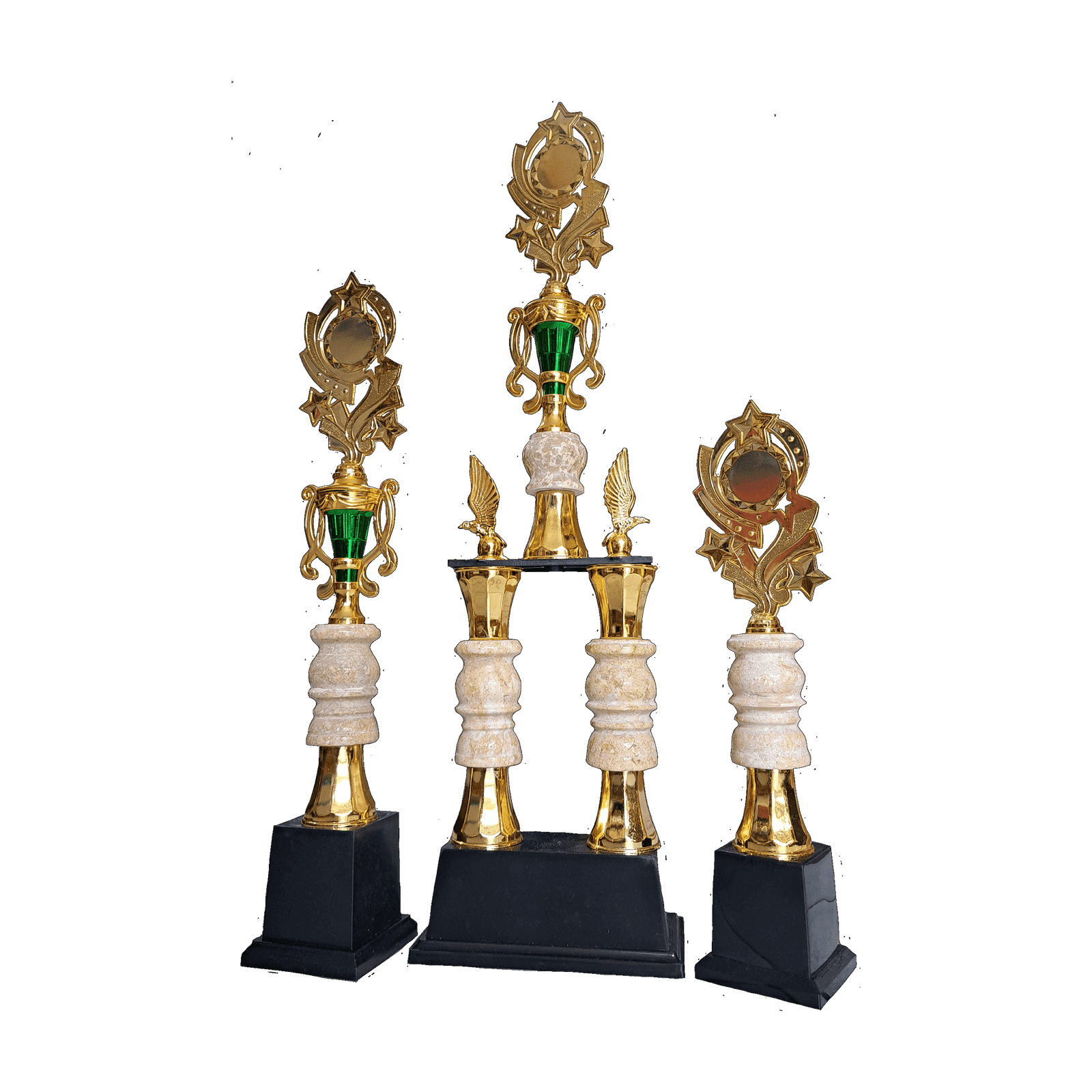 Piala SET004, pilihan tepat untuk merayakan kemenangan! Dapatkan 3 piala sekaligus dengan desain elegan perpaduan marmer putih dan figur silver. Tinggi piala bervariasi, mulai dari 56,5 cm hingga 72 cm, makin mewah dengan base kayu pada juara 1 dan 2. Segera pesan SET004 dan abadikan momen juara Anda!